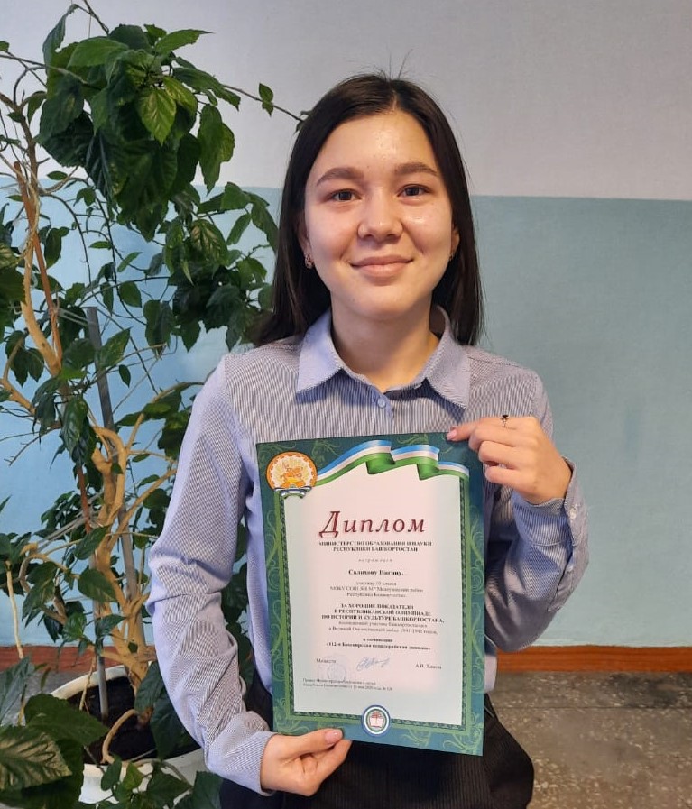 Ученица 10 класса МОБУ СОШ №8 (руководитель Рахматуллина Г.Р.) в номинации «112-я Башкирская кавалерийская дивизия» получила Диплом за высокие показатели от Министерства образования и науки Республики Башкортостан, подписанный А.В.Хажиным.