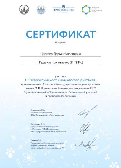 «Химический диктант с каждым годом становится всё интереснее. Я считаю, что участие в нём должны принимать абсолютно все, ведь именно благодаря таким площадкам,мы можем открывать для себя что-либо новое и выявлять свои слабые и сильные стороны.»- поделилась впечатлением после диктанта Циркова Дарья (ученица МОБУ СОШ 8)