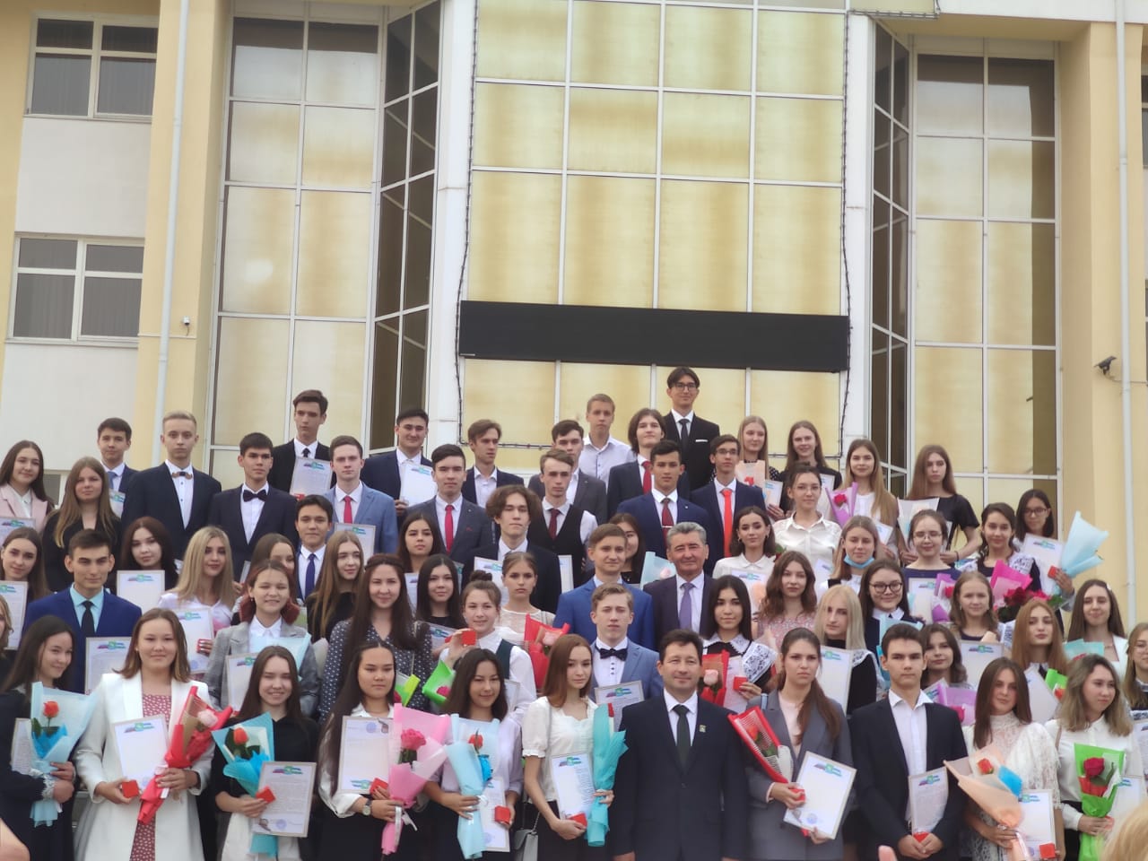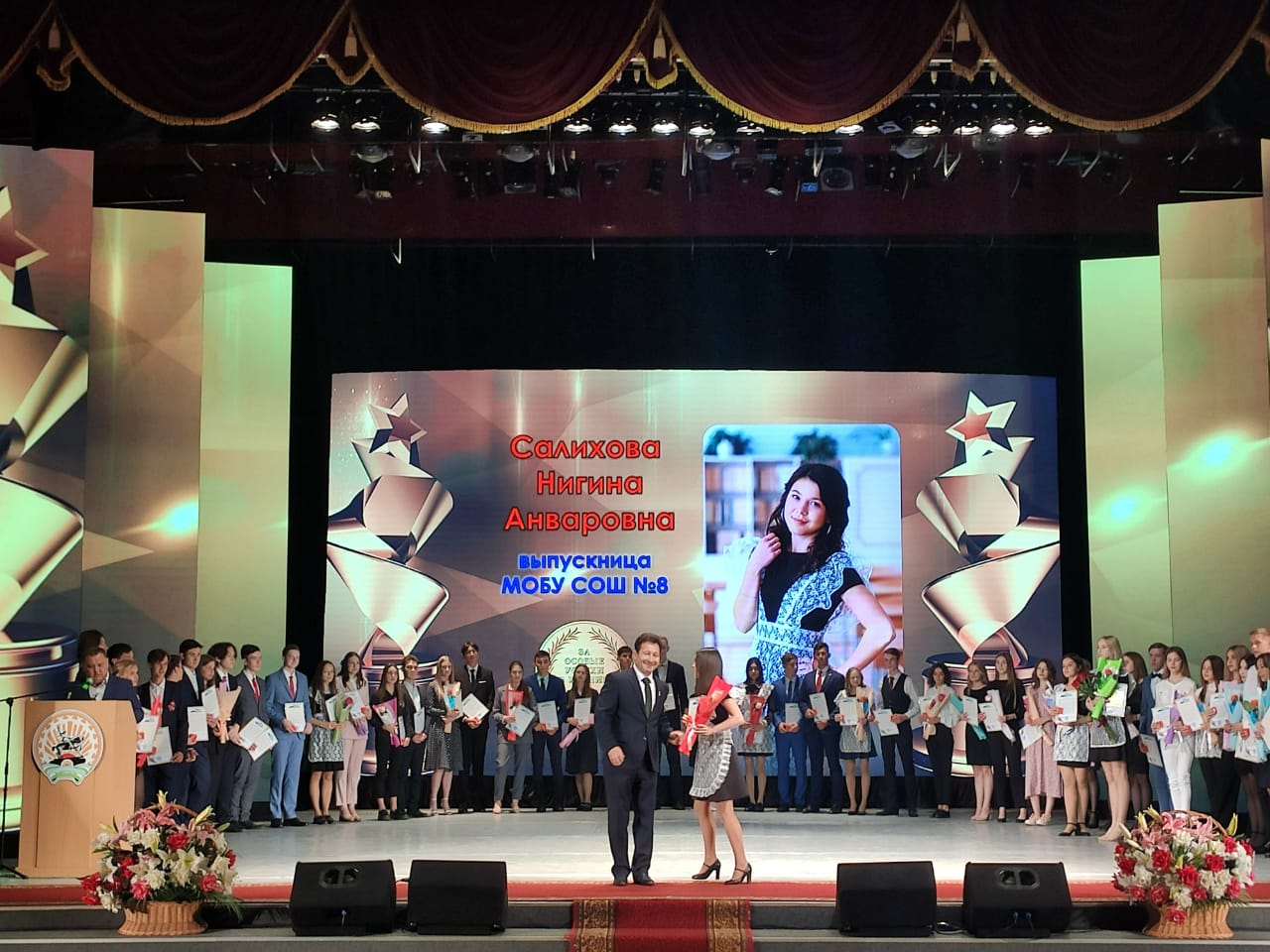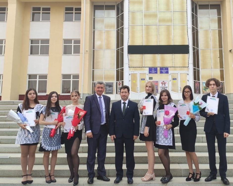 Глава Администрации муниципального района Мелеузовский район Республики Башкортостан Шамсутдинов Рустэм Наилевич поздравил выпускников, родителей и педагогов с этим событием и вручил медали выпускникам.
