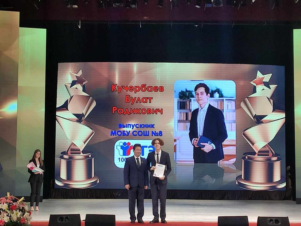 На церемонии чествовали не только медалистов. По результатам единого государственного экзамена выпускник нашей школы Кучербаев Булат набрал 100 баллов по предмету Информатика и ИКТ. Это первый выпускник в истории нашей школы, набравший максимальное количество баллов. Он неоднократно становился победителем и призером олимпиад различного уровня по информатике. Глава Администрации Мелеузовского района вручил Кучербаеву Булату памятный подарок.