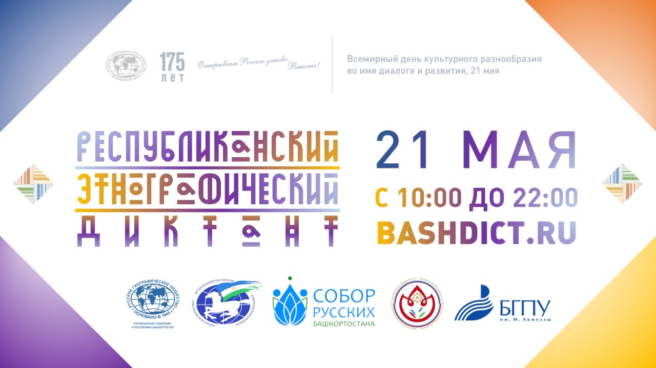 21 мая 2020 года с 10.00 часов до 22 часов по уфимскому времени состоится Республиканский этнографический диктант 2020 посвященный 175-летию основания Русского географического общества, а также Всемирному дню культурного многообразия во имя диалога и развития.